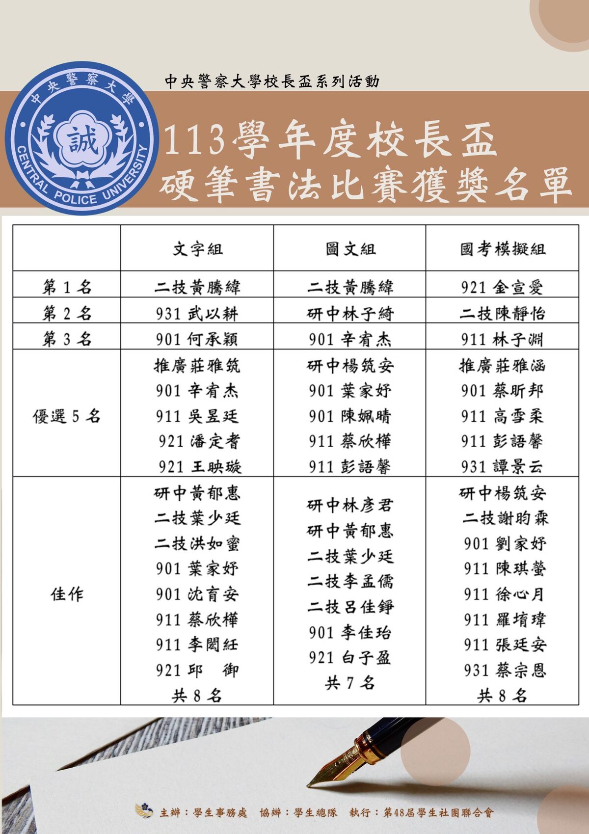 113學年度校長盃硬筆書法比賽業於114年3月14日(星期五)在本校研究大樓講堂舉辦完畢,會後由3位評審老師進行評選,獲獎名單及作品如附圖。