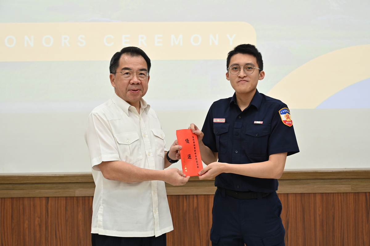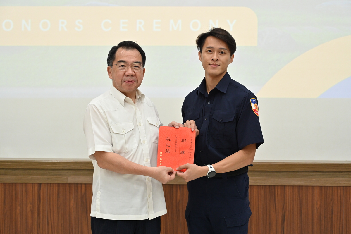 接續頒發本校參加114年全國大專校院運動會榮獲前3名及破紀錄選手獎勵金。本次比賽本校取得6金2銀10銅的佳績,男生組田徑200公尺項目更打破全校紀錄。其中,92期1隊范庭瑜同學在一般女生組跆拳道對打67公斤級連續兩年拿下冠軍、91期1隊江尚育同學更是在一般男生組田徑1萬公尺及5千公尺拿下三連霸的雙料冠軍,校長表示本校人數不多,亦非體育相關校院,卻能有如此佳績,實屬不易。