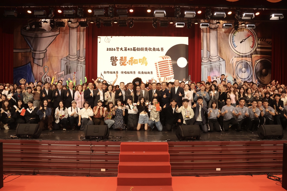 本校於115年3月24日(星期二)晚間舉辦第43屆韶韻獎演唱組及團體歌舞組決賽(下稱韶韻比賽),主題為「警瑟和鳴」。由本校大家長-黃校長帶領各級師長參加,並邀請音樂製作人楊臨慧老師、藝人林威良老師與人氣唱跳歌手楊婷婭老師共同擔任決賽評審。